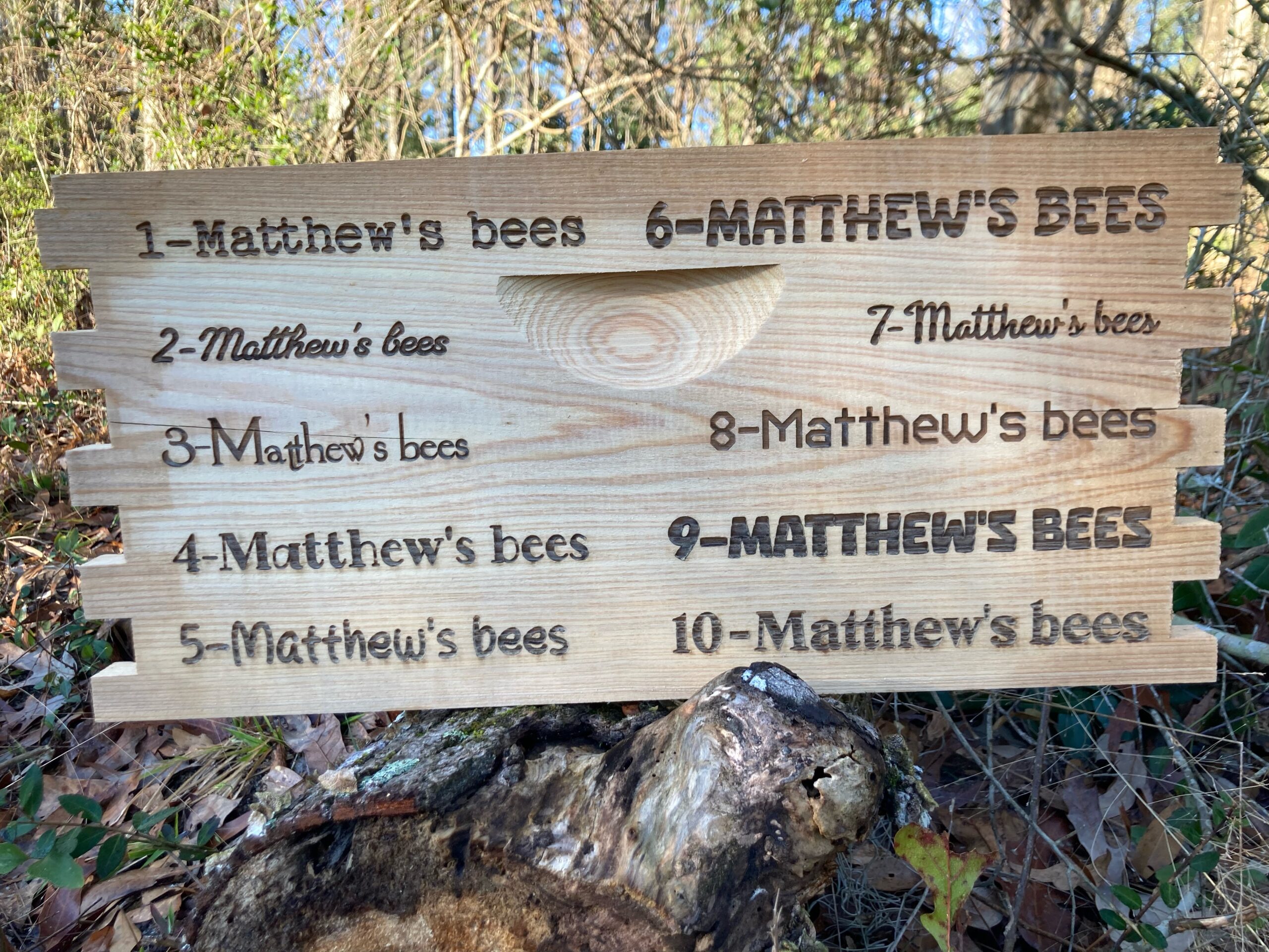 We can laser engrave your hive boxes! Boxes must be unassembled, unpainted, and non-waxed dipped for us to engrave. Basic engraving with simple letters is $5 per side of the box that you want engraved. For example: “Matthew’s Bees” engraved on one side of a box would be considered a single simple engraving.